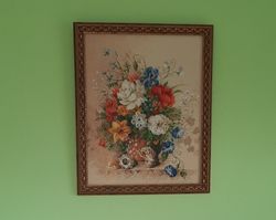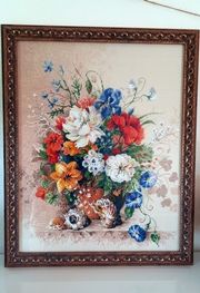 Text der Anzeige in Deutsch: Ich verkaufe gesticktes Gemälde "Flämischer Sommer". Gesticktes Bild im Interieur zieht auf sich die Aufmerksamkeit und schafft die Haus- Atmosphäre. Blumen, die auf dem Bild dargestellt sind, werden besonders gut im Wohnzimmer, in der Küche oder im Flur aussehen.