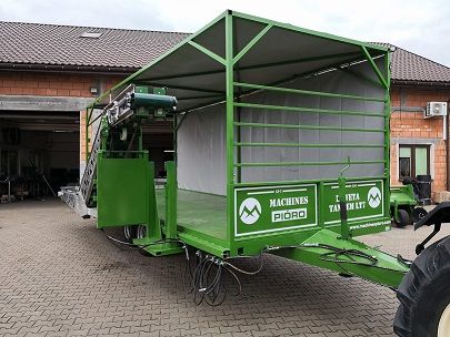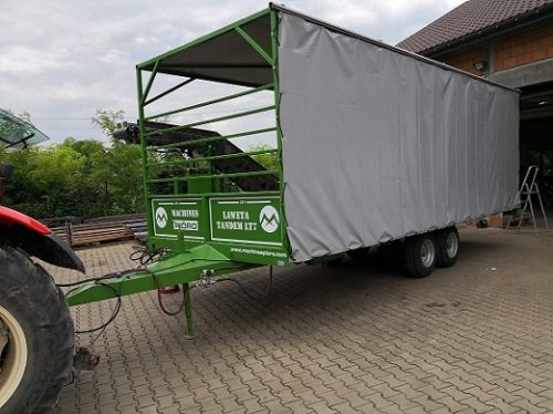 Tekst ogłoszenia w języku polskim: Laweta tandem LT63 MACHINES PIÓRO posiada w standardzie bogate wyposażenie: sprawdzone, wytrzymałe profile ram nośnych oraz wysokiej jakości, niezawodne i trwałe osie jezdne wraz z układem hamulcowym. Laweta posiada oświetlenie. Laweta wraz z przenośnikiem taśmowym do zbioru kapusty. Przenośnik taśmowy o szerokości taśmy 300 mm służy do zbioru kapusty i innych warzyw głowiastych. Urządzenie napędzane jest silnikiem hydraulicznym. Konstrukcja wykonana jest z profili aluminiowych oraz blachy aluminiowej. Podstawowe parametry Parametr Wymiary całkowite 880x313x300 cm Pojemność ładunkowa 12 skrzyniopalet Długość przenośnika w standardzie 770 cm Szerokość przenośnika 30 cm Długość przenośnika w części roboczej w standardzie 355 cm Opcjonalne wyposażenie zabudowana konstrukcja dach oraz firany wraz z oświetleniem wewnętrznym hydrauliczna stopa podporowa przenośnik dłuższy o 1 m przenośnik dłuższy o 2 m przenośnik dłuższy o 3 m przenośnik dłuższy o 4 m tel 666- 978- 500 Łukasz